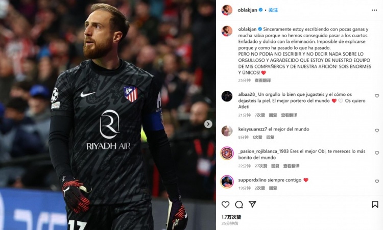 3月13日訊 馬競在本輪歐冠主場(chǎng)被皇馬點(diǎn)球淘汰,門(mén)將奧布拉克在不久前通過(guò)社媒發(fā)文。