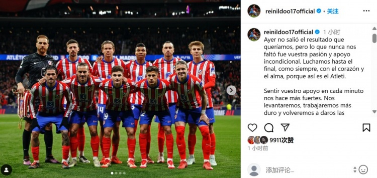 馬競球員雷尼爾多本場(chǎng)首發(fā)出戰,他在個(gè)人社媒曬出全隊賽前合影,配文寫(xiě)道:“昨天我們沒(méi)有得到想要的結果,但是我們從沒(méi)有缺少球迷的熱情和無(wú)條件的支持。我們一如既往拼搏到了最后一刻,因為我們是馬競。感受到你們的支持讓我們更加強大,我們會(huì )再次站起來(lái),努力拼搏,并再一次帶給你們應得的快樂(lè )。感謝大家來(lái)到球場(chǎng)支持,無(wú)論順境還是逆境,讓我們一直團結一致,加油馬競!”