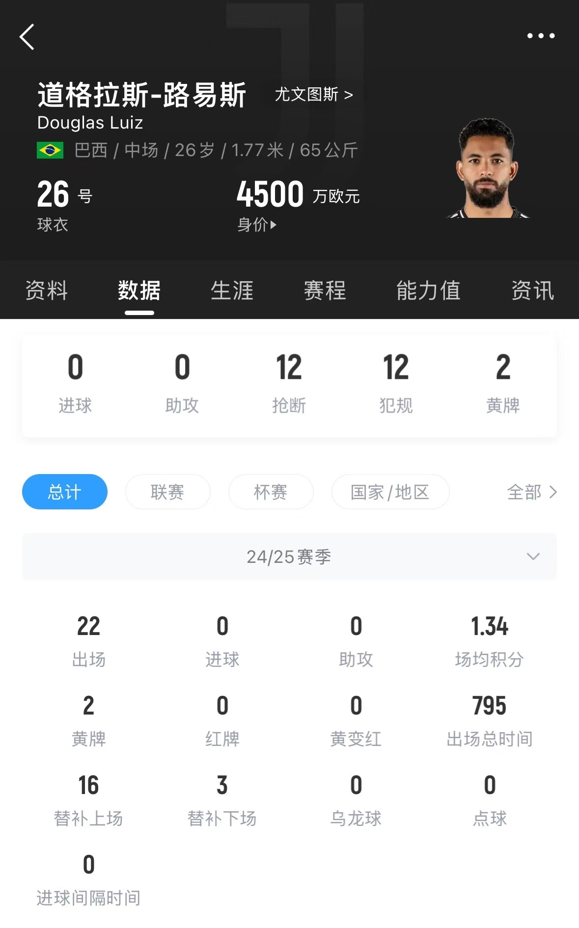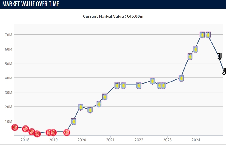 尤文在去年夏天花費5150萬(wàn)歐元從維拉引進(jìn)這名中場(chǎng),本賽季他為尤文出戰22場(chǎng)比賽,沒(méi)有取得進(jìn)球和助攻。值得一提的是,在加盟尤文以后,他的德轉身價(jià)已由原先的7000萬(wàn)歐元,跌至目前的4500萬(wàn)歐元。