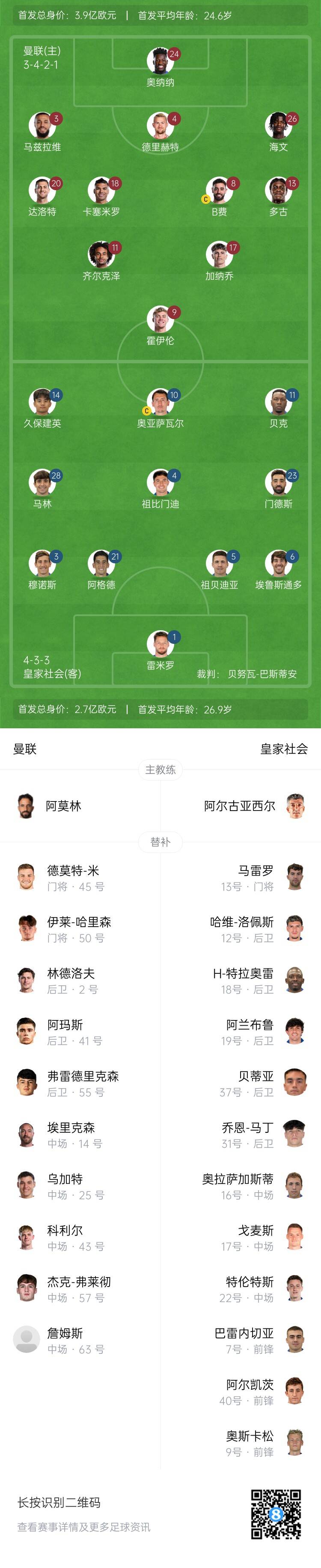 曼聯(lián)首發(fā):24-奧納納、20-達洛特、3-馬茲拉維、4-德利赫特、13-多古、18-卡塞米羅、26-海文、8-B費、17-加納喬、11-齊爾克澤、9-霍伊倫