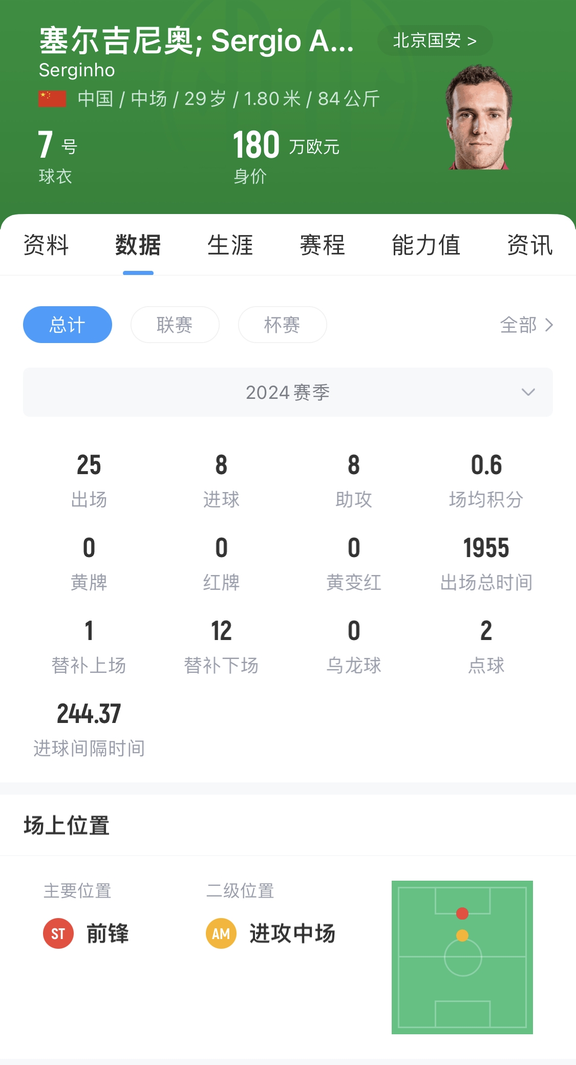 1995年3月15日出生的塞爾吉尼奧原來(lái)?yè)碛邪臀骱鸵獯罄p重國籍,2020年1月加盟長(cháng)春亞泰,代表球隊出戰100場(chǎng)打進(jìn)30個(gè)進(jìn)球,完成23次助攻。2025賽季以40萬(wàn)歐元的身價(jià)轉會(huì )至北京國安。轉換會(huì )籍成功的第二天,塞爾吉尼奧也將迎來(lái)自己的30歲生日。
