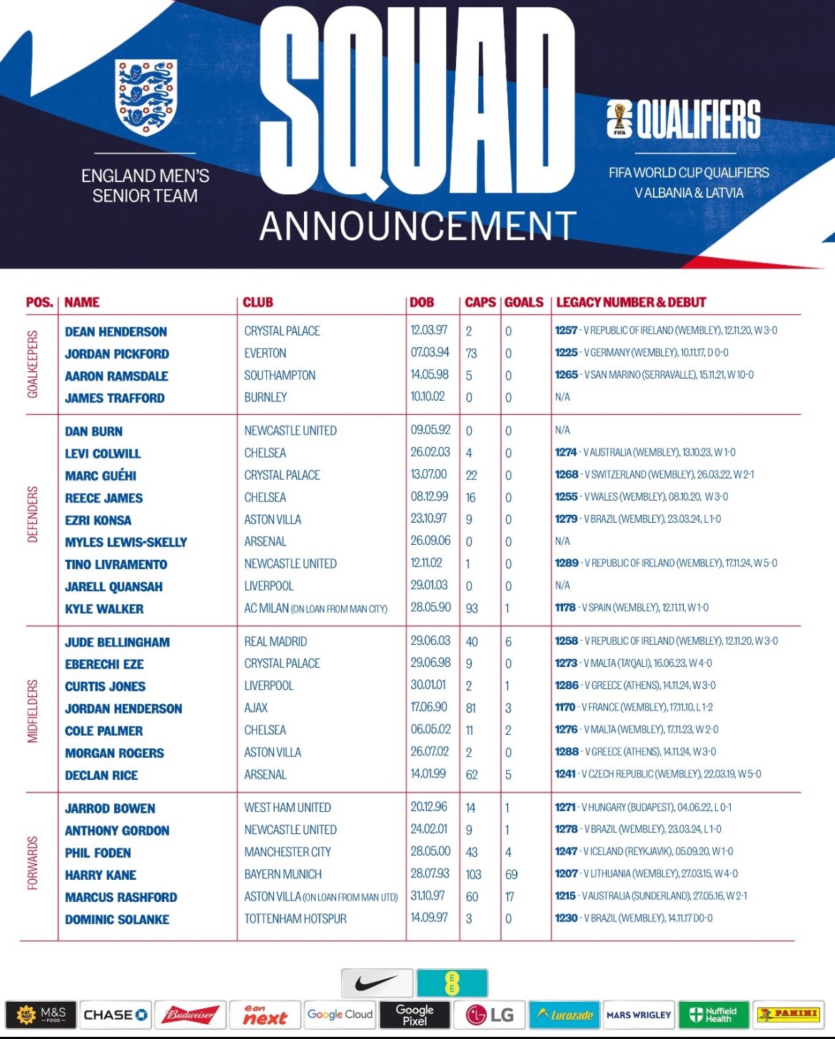 03月14日訊 英格蘭隊公布了新一期名單,這是新帥圖赫爾執教下的首期大名單。