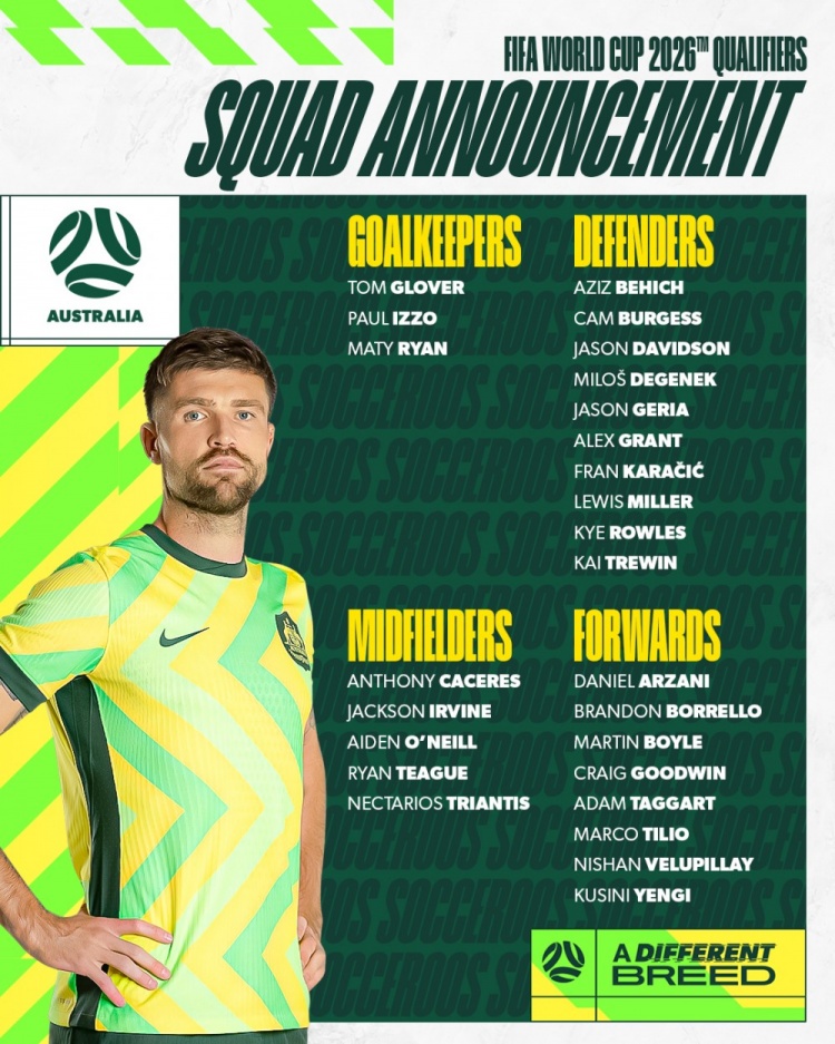 【相關(guān)】澳大利亞隊世預賽名單:“人民球王”古德溫領(lǐng)銜,3月25號對國足