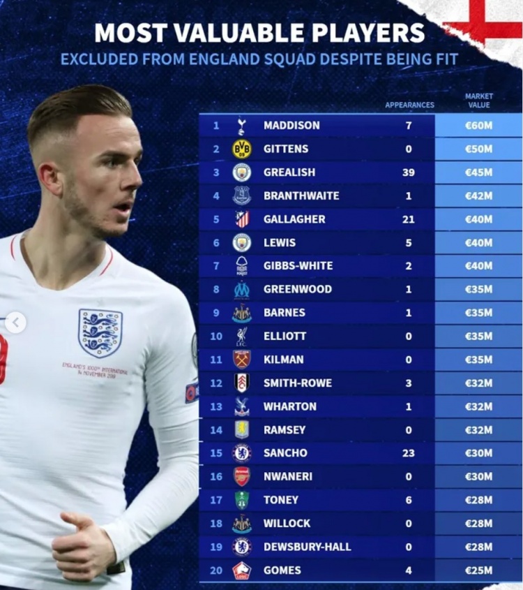 德轉列落選英格蘭隊的健康球員身價(jià)榜:歐元(及生涯國家隊出場(chǎng)數)