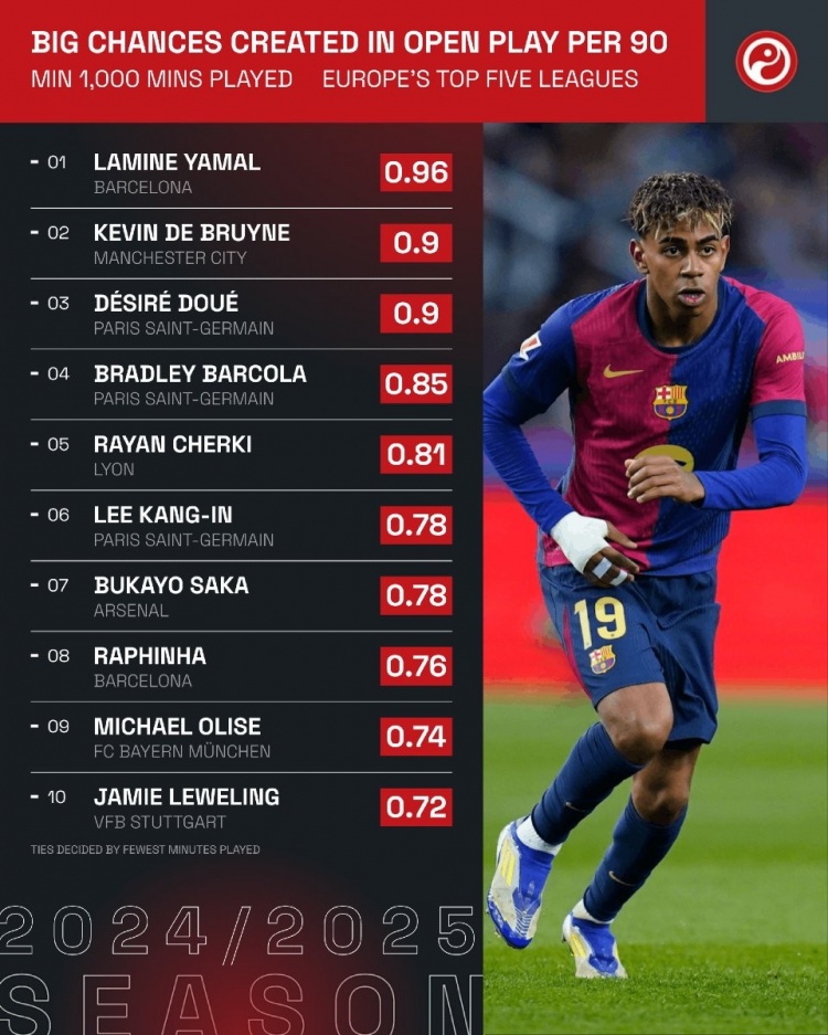 3月14日訊 squakwa統計了本賽季五大聯(lián)賽運動(dòng)戰每90分鐘創(chuàng )造重大機會(huì )情況,17歲亞馬爾力壓群雄。