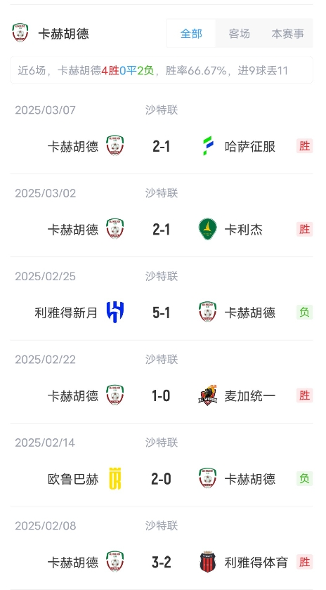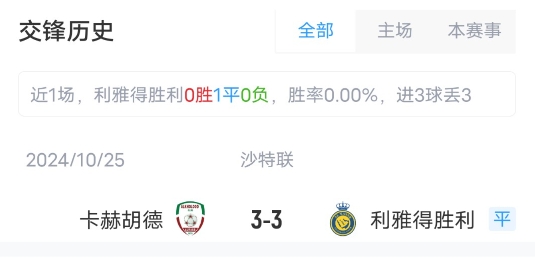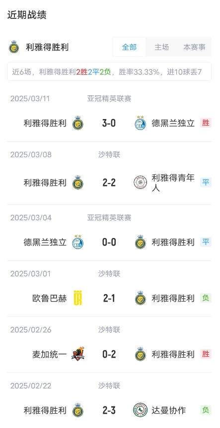 目前利雅得勝利取得了14勝6平4負的成績(jì),積48分,暫居聯(lián)賽第4??ê蘸氯〉昧?勝4平11負成績(jì),積31分,暫居聯(lián)賽第10。