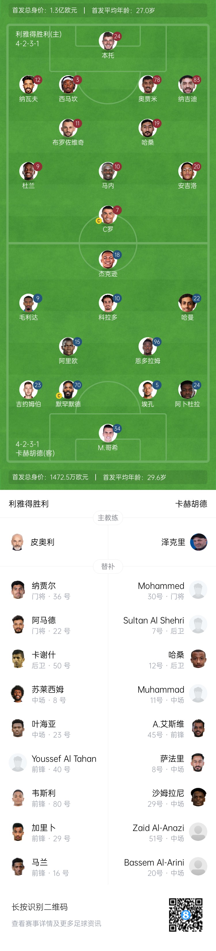 利雅得勝利替補:36-納賈爾、22-阿馬德、50-卡謝什、8-蘇萊西姆、23-葉海亞、80-韋斯利、29-加里卜、16-馬蘭