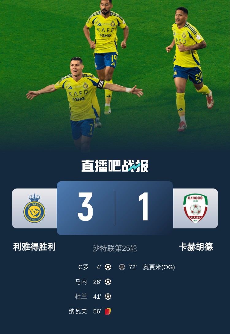C羅破門(mén)+直塞策動(dòng),馬內和杜蘭建功,十人利雅得勝利主場(chǎng)3-1戰勝卡赫胡德。