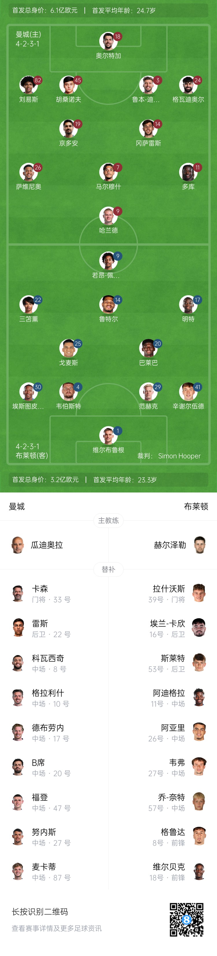 曼城首發(fā):18-奧爾特加、3-魯本-迪亞斯、24-格瓦迪奧爾、45-胡桑諾夫、82-劉易斯、14-尼科-岡薩雷斯、19-京多安、7-馬爾穆什、9-哈蘭德、11-多庫、26-薩維尼奧