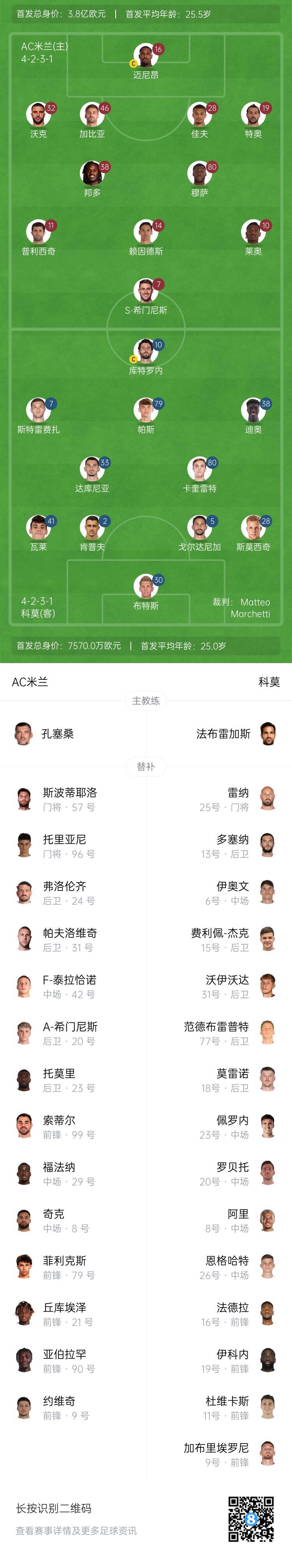 3月16日訊 意甲第29輪,AC米蘭主場(chǎng)對陣科莫。賽前,官方公布了本場(chǎng)的首發(fā)名單。