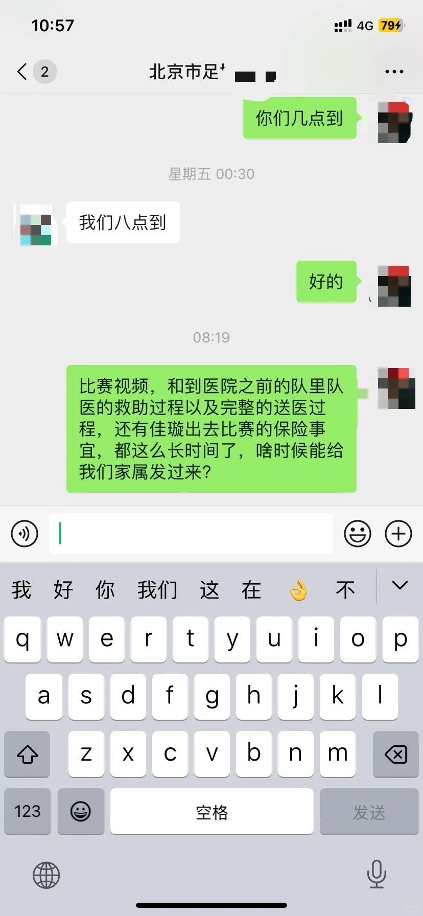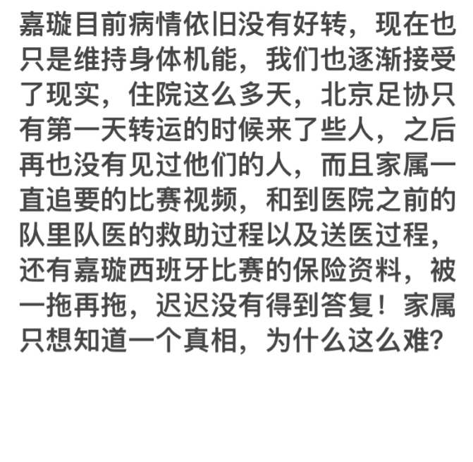 嘉璇目前病情依舊沒(méi)有好轉,現在也只是維持身體機能,我們也逐漸接受了現實(shí),住院這么多天,北京足協(xié)只有第一天轉運的時(shí)候來(lái)了些人,之后再也沒(méi)有見(jiàn)過(guò)他們的人,而且家屬一直追要的比賽視頻,和到醫院之前的隊里隊醫的救助過(guò)程以及送醫過(guò)程,還有嘉璇西班牙比賽的保險資料,被一拖再拖,遲遲沒(méi)有得到答復!家屬只想知道一個(gè)真相,為什么這么難?
