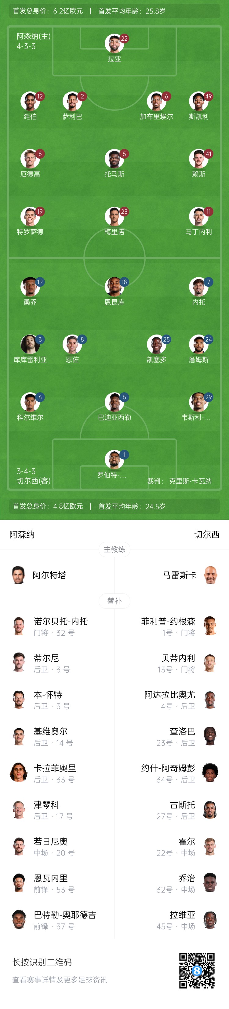 阿森納替補:32-內托、3-蒂爾尼、4-本-懷特、15-基維奧爾、17-津琴科、20-若日尼奧、33-卡拉菲奧里、37-奧耶德吉、53-恩瓦內里