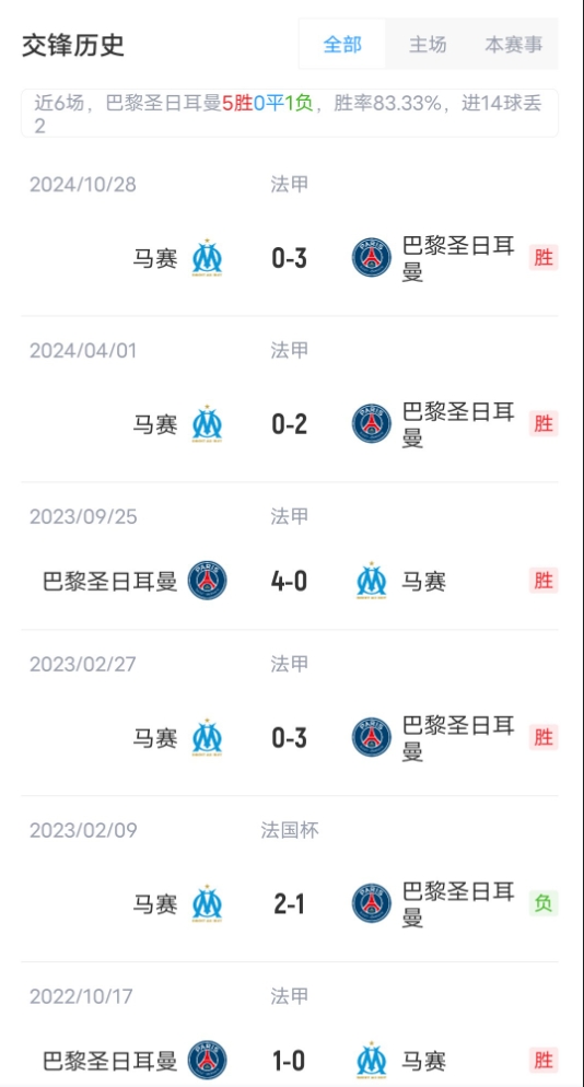 目前法甲聯(lián)賽巴黎取得了20勝5平的成績(jì),積65分高居聯(lián)賽榜首。馬賽取得了15勝4平6負的成績(jì),積49分位居聯(lián)賽第二。