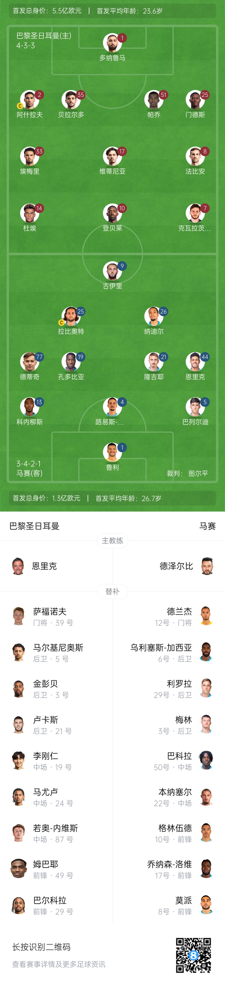 巴黎首發(fā):1-多納魯馬、2-阿什拉夫、35-貝拉爾多、51-帕喬、25-努諾-門(mén)德斯、8-法比安、17-維蒂尼亞、33-扎伊爾-埃梅里、7-克瓦拉茨赫利亞、10-登貝萊、14-杜埃