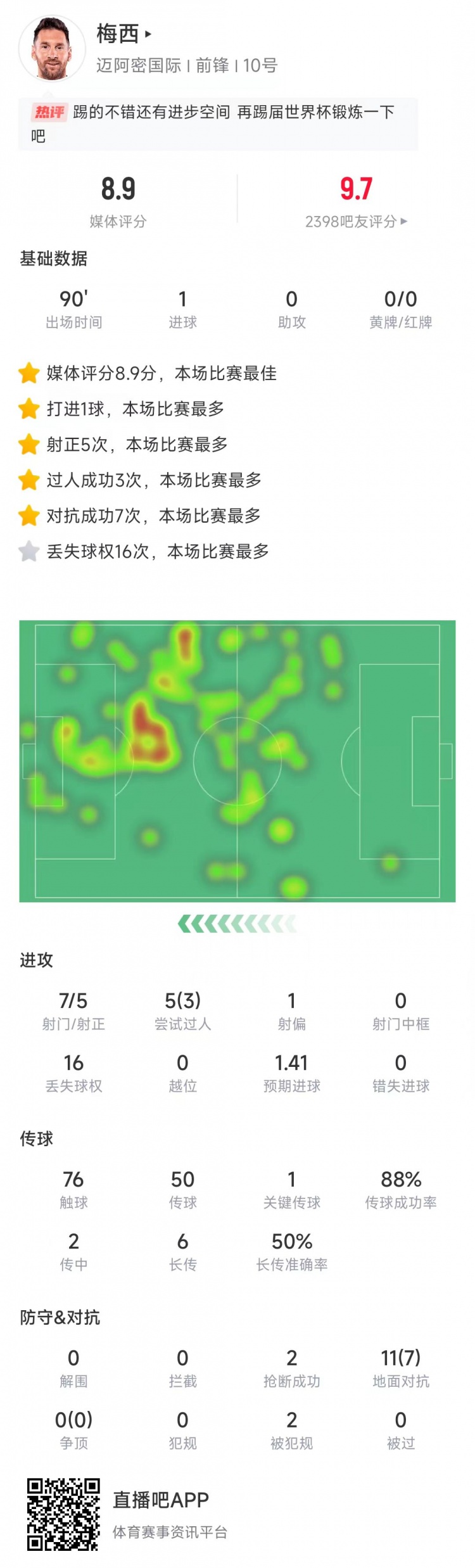 梅西本場(chǎng)比賽數據: