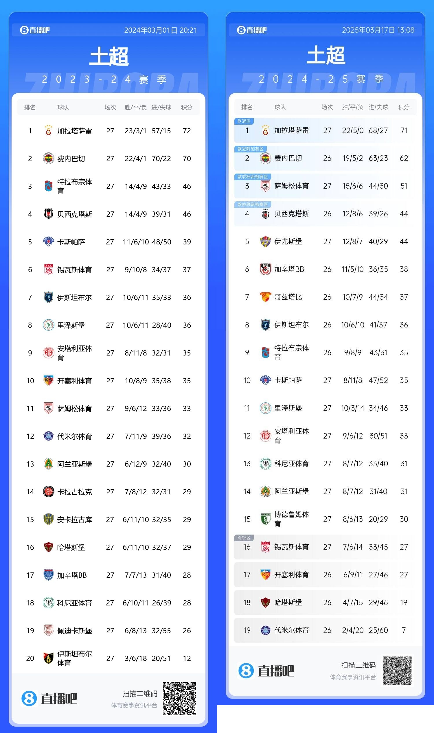 在去年,費內巴切和加拉塔薩雷是土超絕對的統治者,兩隊的爭冠可謂龍爭虎斗。在去年打完27場(chǎng)比賽的時(shí)候,加拉塔薩雷和費內巴切只差2分,而他們領(lǐng)先身后第3名達到24分。這兩隊也在爭冠沖刺時(shí)你追我趕,最終加拉塔薩雷以102分奪得土超冠軍,費內巴切99分屈居亞軍,第2的費內巴切領(lǐng)先第3的特拉布宗體育32分。