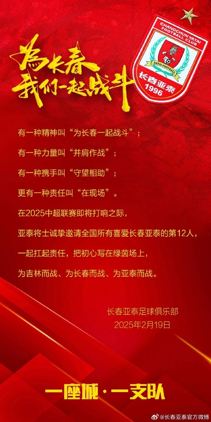 2月19日,正在上海備戰的長(cháng)春亞泰舉行了以“為長(cháng)春一起戰斗”為主題的2025賽季華潤飲料中超聯(lián)賽出征儀式。俱樂(lè )部總經(jīng)理曾皎峰受吉林省體育局、長(cháng)春市體育局委托,向亞泰將士授旗,希望亞泰將士與第12人一起扛起責任,把初心寫(xiě)在綠茵場(chǎng)上,為吉林而戰、為長(cháng)春而戰、為亞泰而戰?!伴L(cháng)春亞泰是中國職業(yè)足球俱樂(lè )部中為數不多的,有著(zhù)悠久的歷史傳承的俱樂(lè )部。新賽季即將打響,我們團隊中的每個(gè)人要滿(mǎn)懷信心,時(shí)刻秉記責任、使命,為這個(gè)優(yōu)秀的集體做出自己的貢獻,贏(yíng)得榮譽(yù)?!敝鹘叹氈x暉說(shuō)。