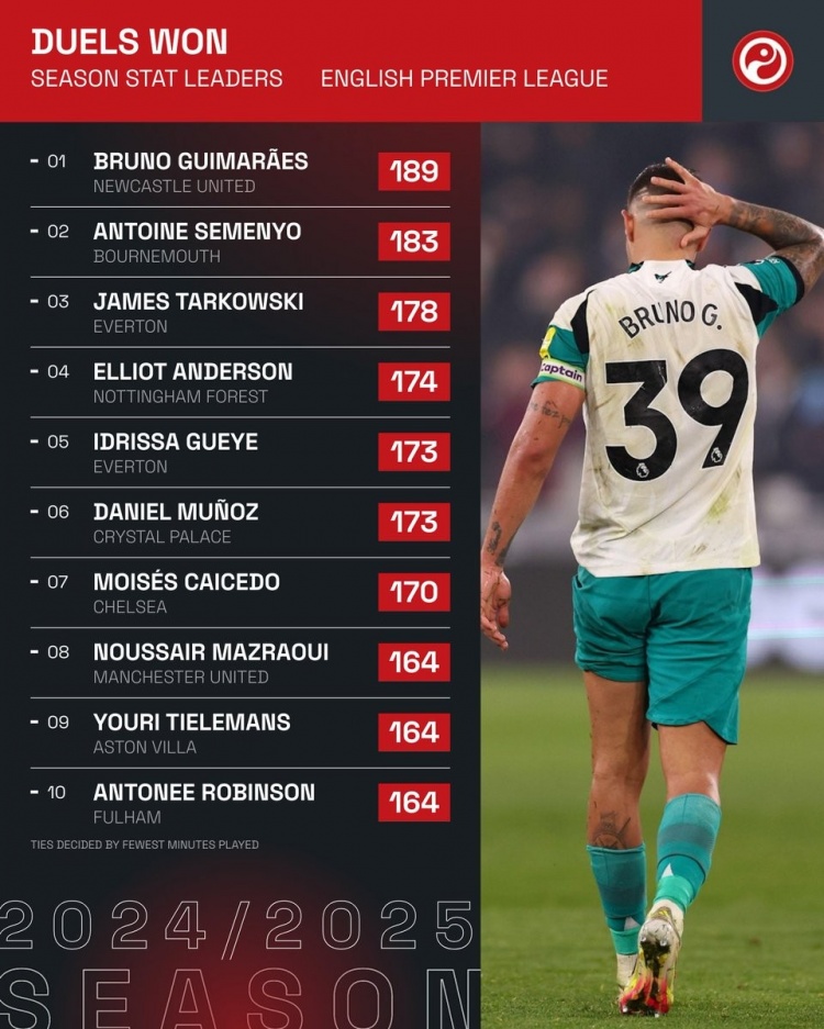3月18日訊 國家隊比賽周到來(lái),英超也暫時(shí)告一段落,squakwa統計了本賽季英超成功對抗情況,吉馬良斯居首。