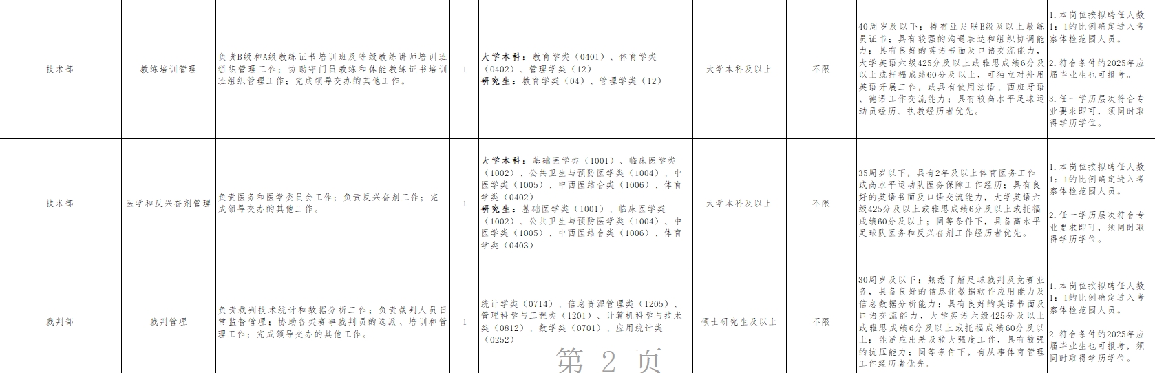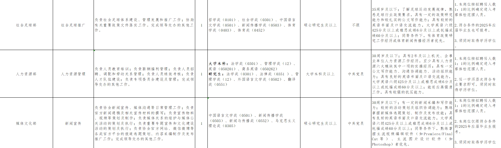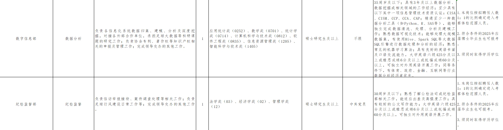 另外,綜合部(財務(wù)審核)、國家隊管理部(隊伍管理)、裁判部(裁判管理)、社會(huì )足球部(社會(huì )足球推廣)、媒體文化部(新聞宣傳)、數字信息部(數據分析)、紀檢監督部(紀檢監督)要求學(xué)歷為碩士研究生及以上,其余崗位為大學(xué)本科及以上。