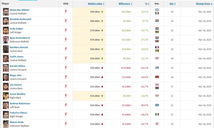 3月18日訊 德轉更新了部分英超球員身價(jià),在此次更新中有13位利物浦球員身價(jià)發(fā)生了變化,其中6人出現下跌,7人出現上漲。