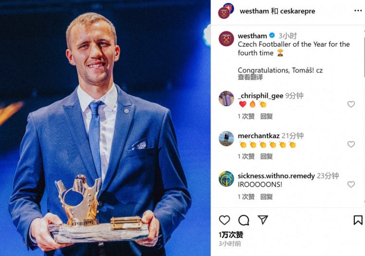 西漢姆官方賬號也轉發(fā)了該消息,并配文:“第4次當選捷克足球先生。祝賀你,紹切克!”