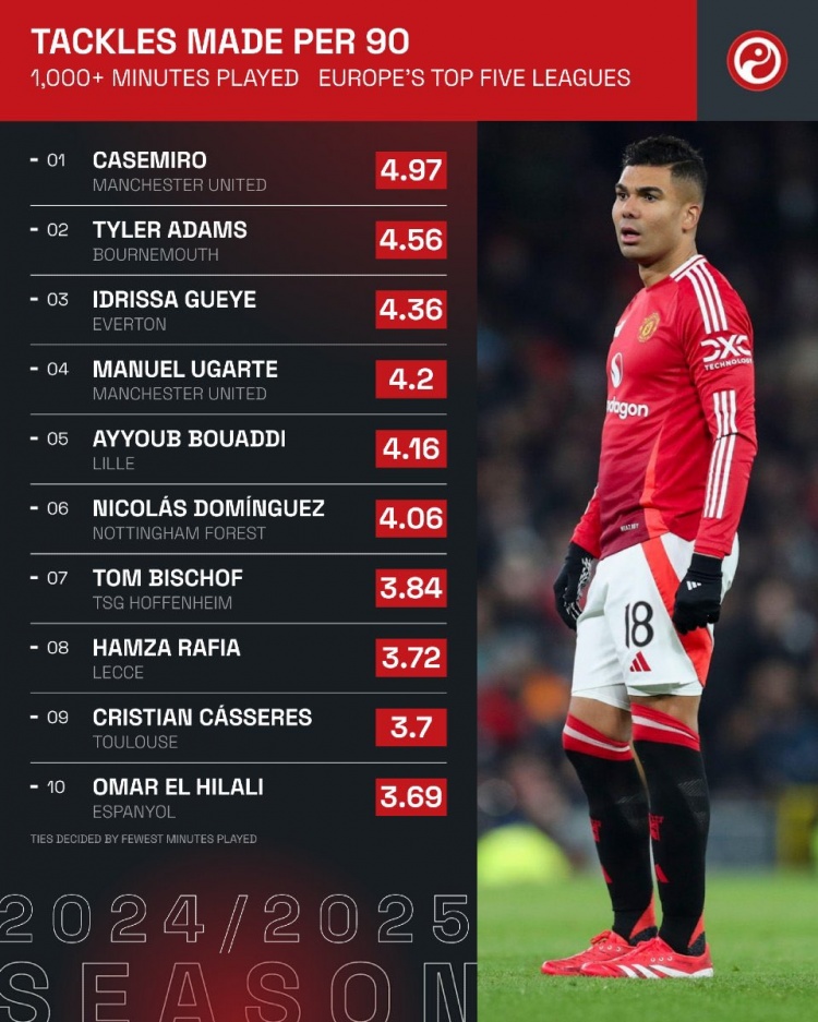 3月19日訊 Squawka統計了本賽季球員在五大聯(lián)賽每90分鐘完成搶斷的次數,并列出榜單,卡塞米羅4.97次居首,亞當斯、蓋耶二三位。