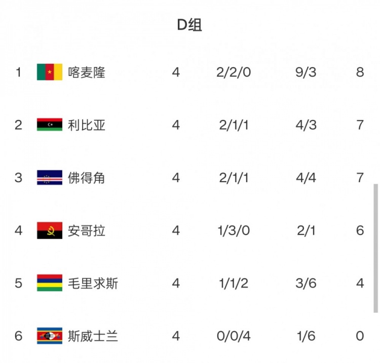 D組:8次參加世界杯的喀麥隆占據榜首,利比亞、佛得角、安哥拉緊隨其后