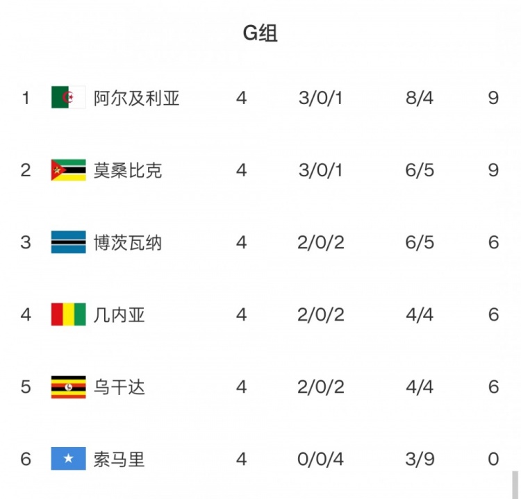 G組:阿爾及利亞、莫桑比克同積9分,3-5名同積6分,后續交手均不容有失