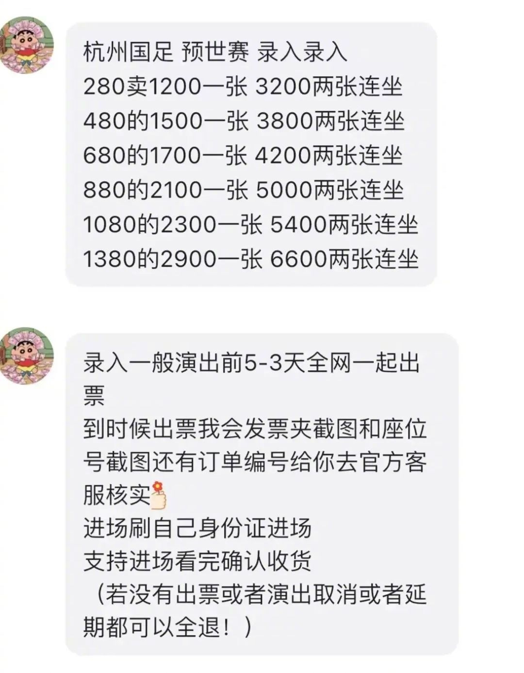 3月10日,中國新聞周刊聯(lián)系上某賣(mài)家,并提出希望求購3月25日國足球票,賣(mài)家表示,自己手中還有部分存票。每張加價(jià)1000—1500元不等。但到了3月18日,這個(gè)價(jià)格再次攀升,票面價(jià)格1380元的球票需要支付6500元方可購買(mǎi),而如果需要連號球票或是位置更佳座位,價(jià)格將達到近萬(wàn)元。