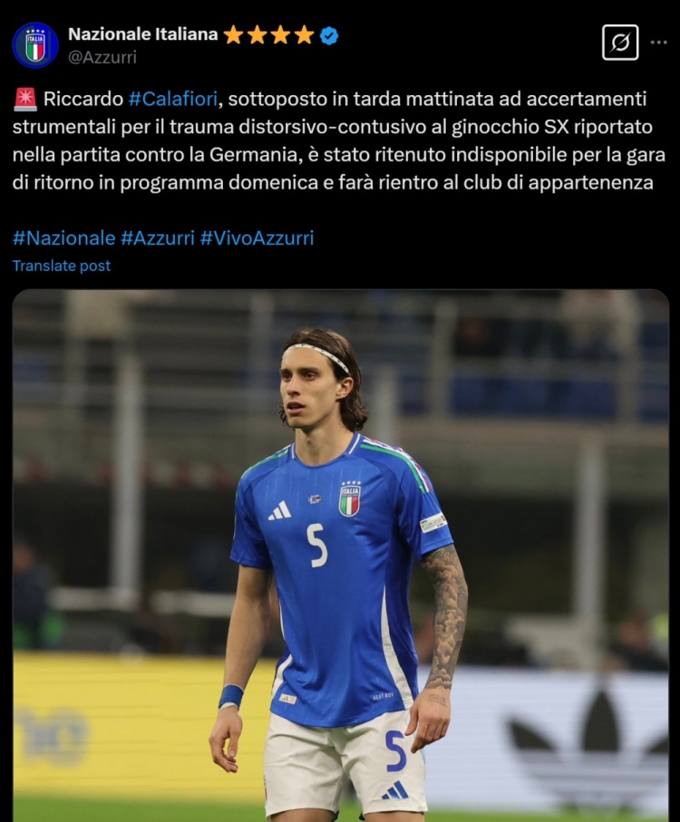 意大利隊官方:卡拉菲奧里左膝扭傷+挫傷,將返回阿森納
