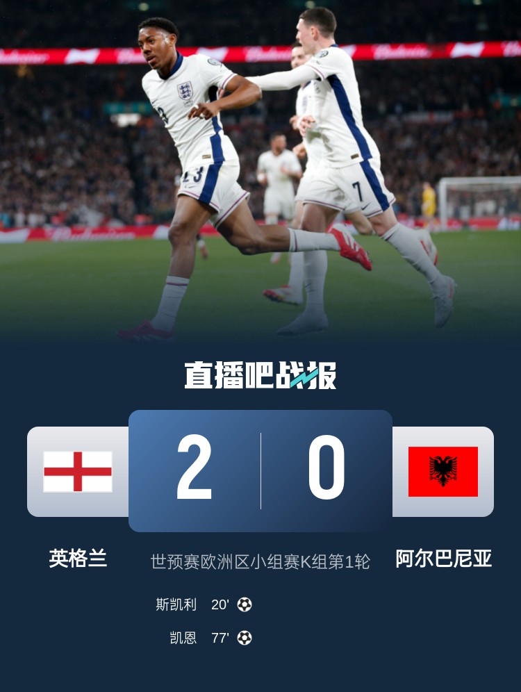 18歲斯凱利首秀迎處子球,凱恩斬獲英格蘭生涯第70球,英格蘭主場(chǎng)2-0戰勝阿爾巴尼亞。