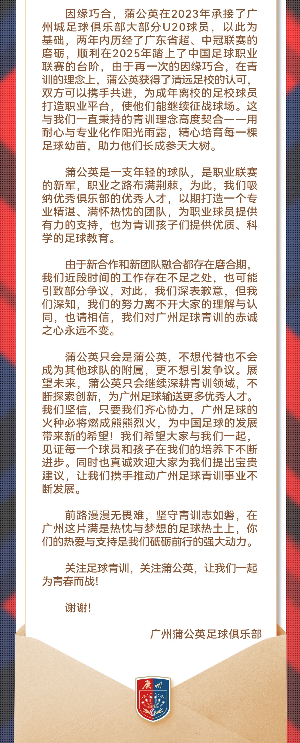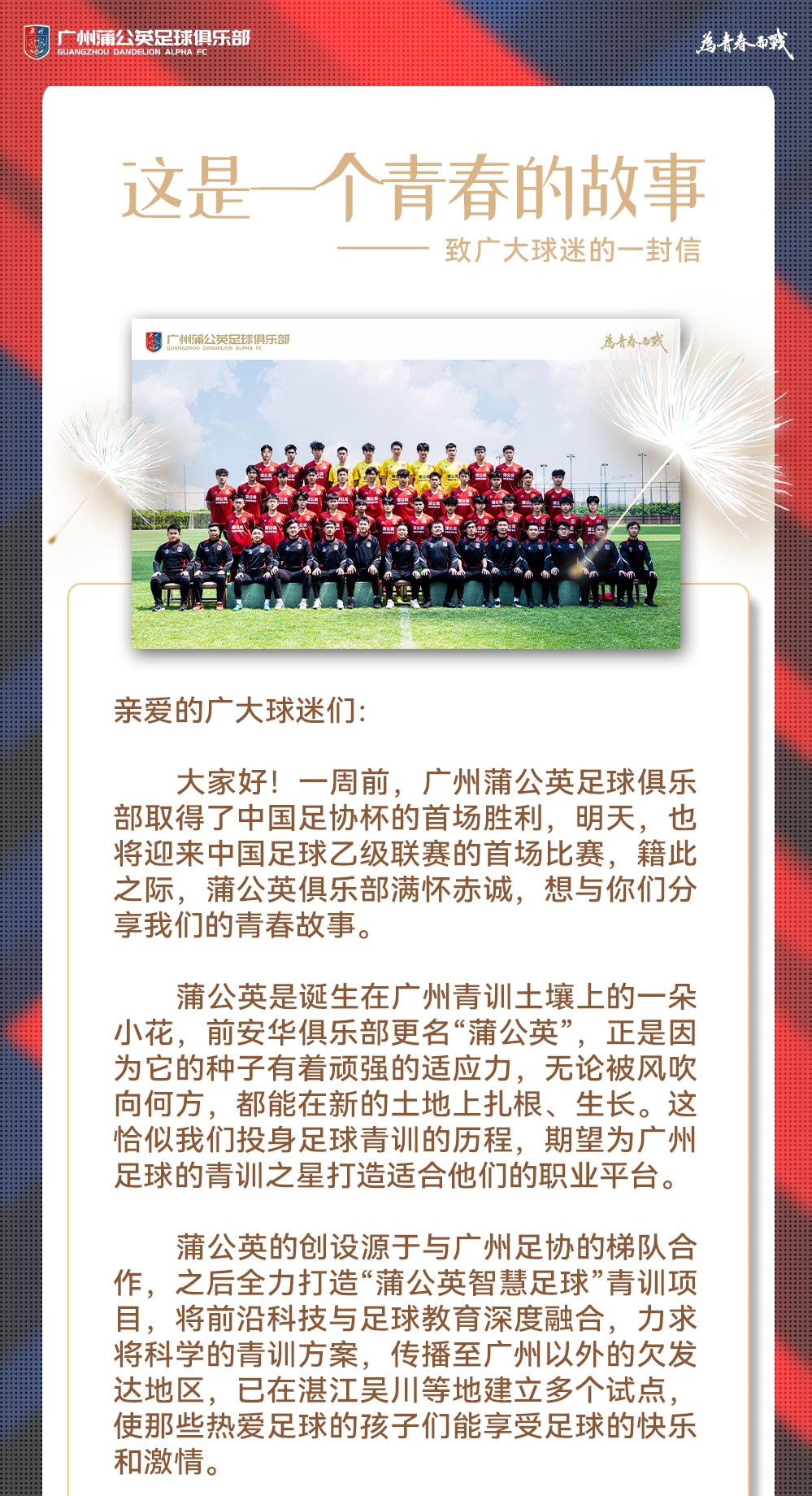 03月22日訊 2025賽季中乙本周開(kāi)賽,新軍廣州蒲公英在收隊比賽前發(fā)布了致廣大球迷的一封信,在信中俱樂(lè )部講述了球隊的歷史,并表達了將做好青訓的決心和對球迷的感謝。