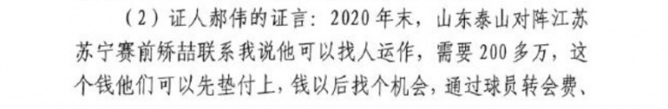 2020年末,山東泰山對陣江蘇蘇寧賽前矯喆聯(lián)系我說(shuō)他可以找人運作,需要200多萬(wàn),這個(gè)錢(qián)他們可以先墊付上,錢(qián)以后找個(gè)機會(huì ),通過(guò)球員轉會(huì )費、簽字費把錢(qián)賺回來(lái),我同意了,矯喆就去做江蘇球員“工作”,加上我這邊讓球員全力以赴去踢,最終這場(chǎng)比賽的比分是山東泰山隊2-0江蘇蘇寧,我們(足協(xié)杯)奪冠了。矯喆和我說(shuō)他們運作這場(chǎng)球花了200萬(wàn),這個(gè)錢(qián)是矯喆他們出的。我沒(méi)有主動(dòng)還過(guò)這個(gè)錢(qián),但是我把矯喆招到我們隊當助理教練了,給他找了個(gè)工作,也算是還他幫我的運作這場(chǎng)比賽的人情了。
