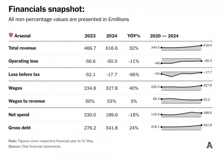 盡管阿森納在營(yíng)收方面屢創(chuàng )佳績(jì),但從最新的財報來(lái)看,他們還是處于虧損之中。上賽季他們的稅前赤字總計為1770萬(wàn)英鎊。