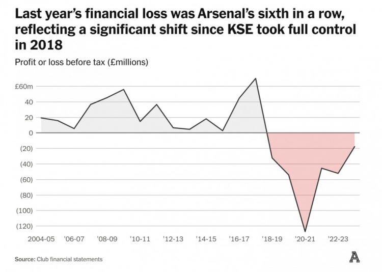 在2018年之后,阿森納連續六年出現財務(wù)虧損,也體現了阿森納財務(wù)所有權重大轉變后的影響