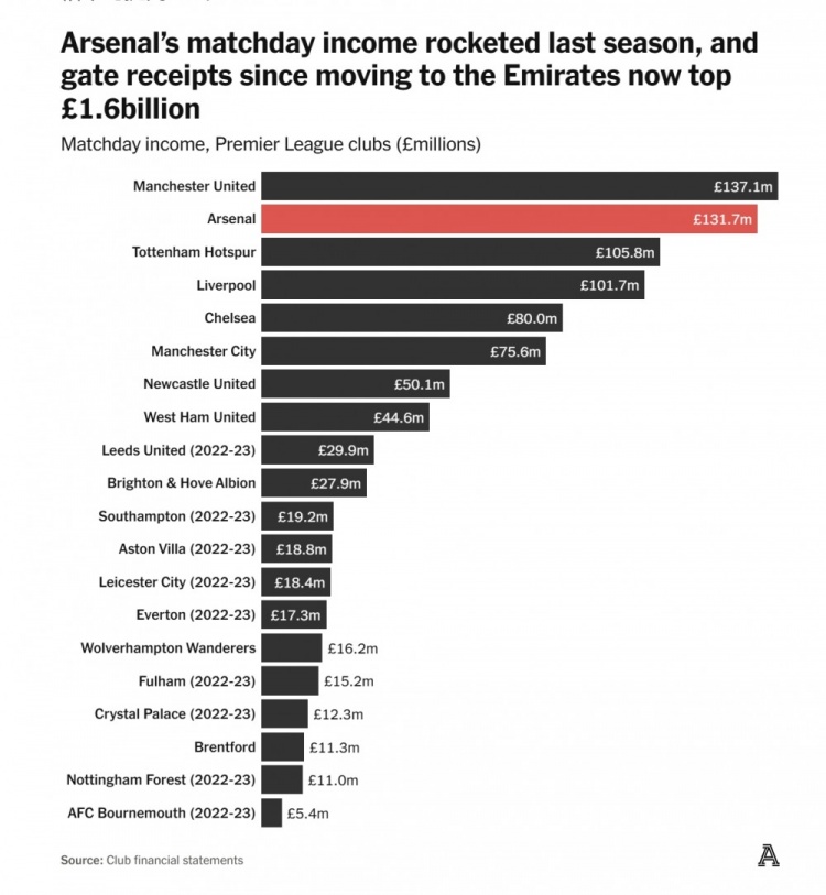 所以,那個(gè)賽季阿森納拿下了單賽季隊史最高門(mén)票收入,國內比賽日收入躍升聯(lián)賽第二位。去年阿森納的比賽日收入僅比曼聯(lián)少了550萬(wàn)英鎊,這也意味著(zhù)兩隊之間的差距明顯縮?。捍饲皟蓚€(gè)賽季,兩隊的比賽日收入都相差超過(guò)3000萬(wàn)英鎊。盡管酋長(cháng)球場(chǎng)的建設成本,可能在過(guò)去幾年里限制了球隊的發(fā)展,但如今搬遷的好處正在越來(lái)越明顯。