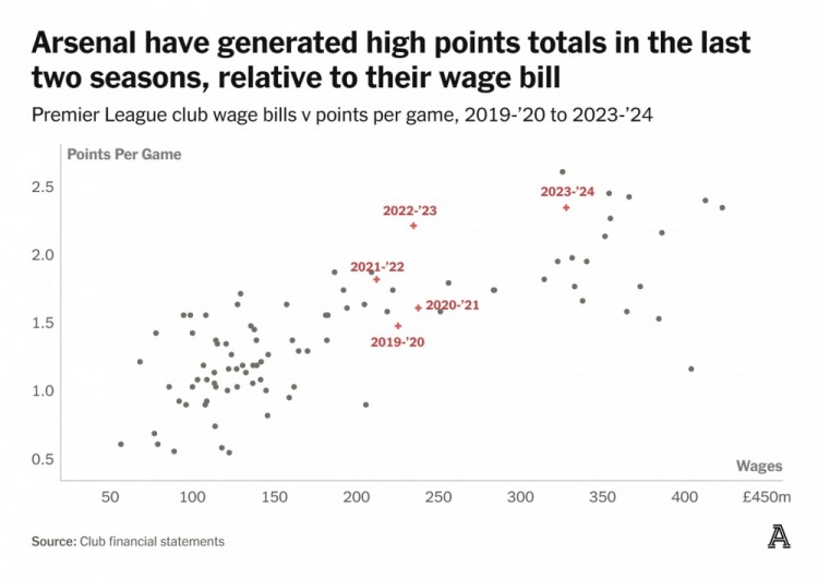 在過(guò)去兩個(gè)賽季中,阿爾特塔治下的阿森納開(kāi)始不斷刷新自己賬單紀錄。2022/2023賽季,他們以英超第六高的人工成本,拿到了聯(lián)賽亞軍。上個(gè)賽季,他們則是以英超第五高的人工成本,再奪聯(lián)賽亞軍。