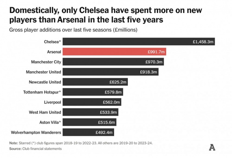過(guò)去五年,只有切爾西在轉會(huì )市場(chǎng)上的投入超過(guò)阿森納