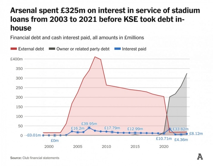 2003年到2021年,KSE內部承擔債務(wù)之前,阿森納在球場(chǎng)貸款利息上花費了3.25億英鎊