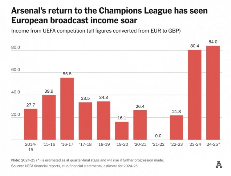 重返歐冠聯(lián)賽之后,阿森納在歐戰賽事中獲取的轉播收入飆升