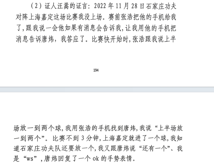 汪嵩證言:2022年11月28日石家莊功夫對陣上海嘉定這場(chǎng)比賽我沒(méi)上場(chǎng)。賽前張浩把他的手機給我了,跟我說(shuō)一會(huì )他如果有消息會(huì )告訴我,讓我用他的手機把消息告訴唐煒,我答應了。比賽快開(kāi)始時(shí),張浩跟我說(shuō)上半場(chǎng)放一到兩個(gè)球,我用張浩的手機找到唐煒,我說(shuō)“上半場(chǎng)放一到兩個(gè)”。比賽不到3分鐘,上海嘉定就進(jìn)了一個(gè)球,我知道石家莊功夫隊還要放一個(gè),我又跟唐煒說(shuō)“還有一個(gè)”,我是“ws”,唐煒回復了一個(gè)ok的手勢表情。