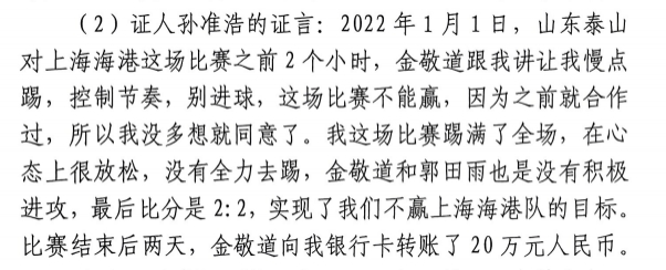 其中孫準浩的證言為:“2022年1月1日,山東泰山對上海海港這場(chǎng)比賽之前2個(gè)小時(shí),金敬道跟我講讓我慢點(diǎn)踢,控制節奏,別進(jìn)球,這場(chǎng)比賽不能贏(yíng),因為之前就合作過(guò),所以我沒(méi)多想就同意了。我這場(chǎng)比賽踢滿(mǎn)了全場(chǎng),在心態(tài)上很放松,沒(méi)有全力去踢,金敬道和郭田雨也是沒(méi)有積極進(jìn)攻,最后比分是2:2,實(shí)現了我們不贏(yíng)上海海港隊的目標。 比賽結束后兩天,金敬道向我銀行卡轉賬了20萬(wàn)元人民幣?!?/p>