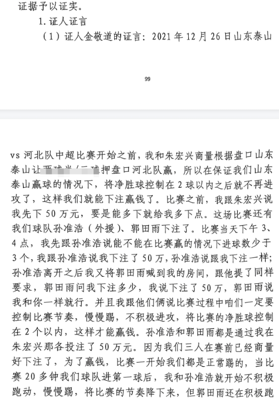 金敬道證言:踢河北我和孫準浩、郭田雨各下注50萬(wàn),一起控制節奏
