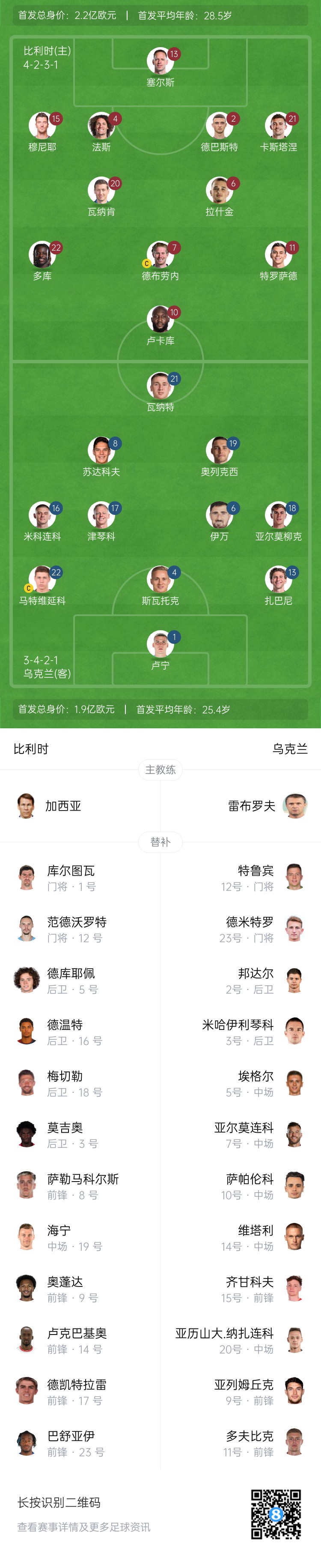 歐國聯(lián)-比利時(shí)vs烏克蘭首發(fā):盧卡庫、德布勞內先發(fā),多庫出戰