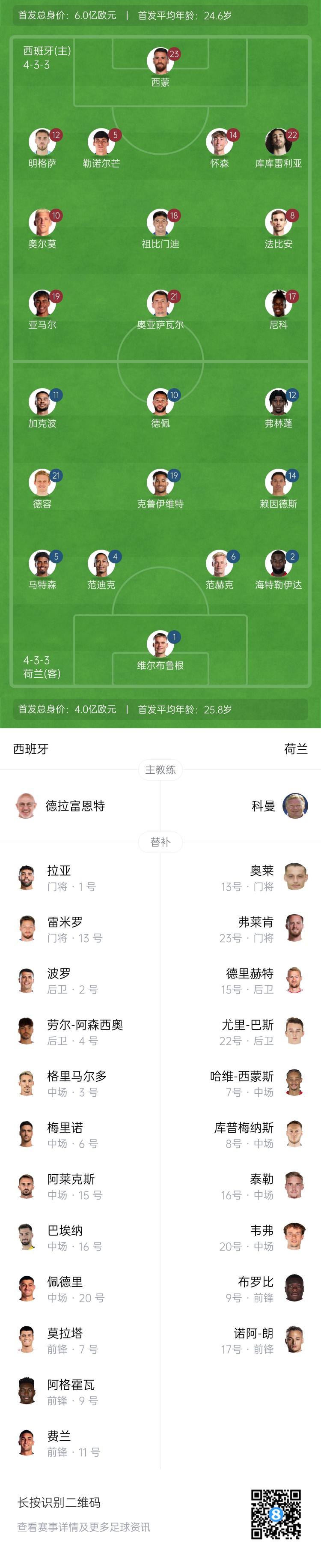 西班牙首發(fā):23-烏奈-西蒙、12-明格薩、5-勒諾爾芒、14-懷森、22-庫庫雷利亞、18-祖比門(mén)迪、8-法比安、10-奧爾莫、19-亞馬爾、17-尼科-威廉姆斯、21-奧亞薩瓦爾