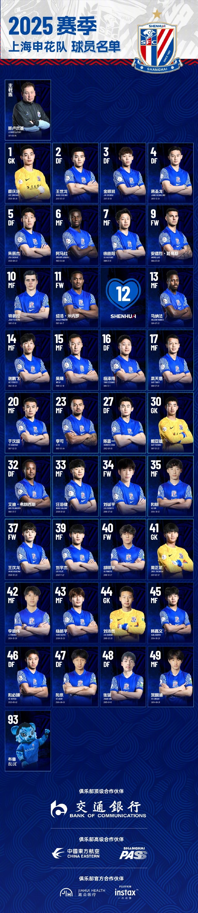 2月20日訊 上海申花官方公布了2025賽季一線(xiàn)隊球員名單,阿馬杜、路易斯、特謝拉、米內羅、馬納法5名外援領(lǐng)銜,吳曦、朱辰杰、于漢超、李可、劉誠宇等球員在列,共35名球員入選。