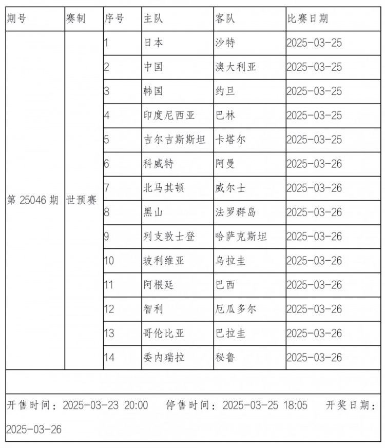 傳足勝負彩第25046期競猜賽事為亞洲區、歐洲區和南美區的世界杯預選賽。本期,亞洲區中國、日本和韓國東亞三強將分別在主場(chǎng)對陣澳大利亞、沙特和約旦,南美區則迎來(lái)阿根廷VS巴西的重頭戲。