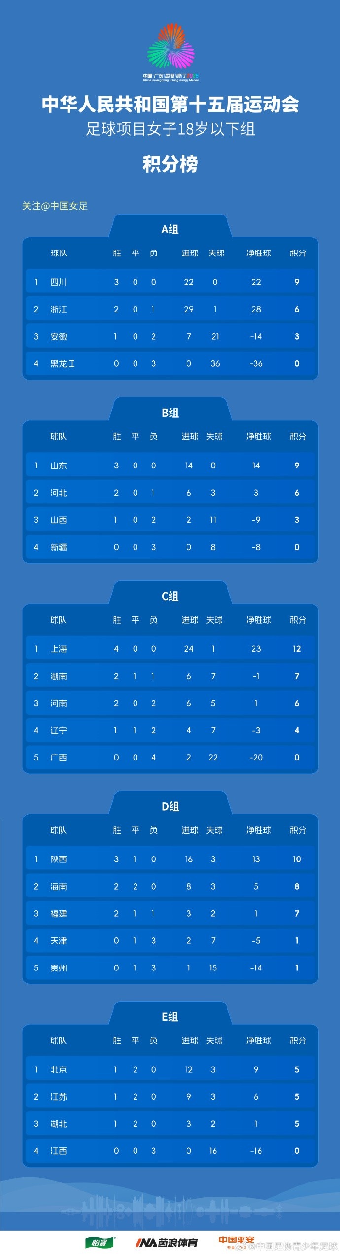全運會(huì )女足U18資格賽(CD組)第5輪、(ABE組)第3輪賽果+積分榜
