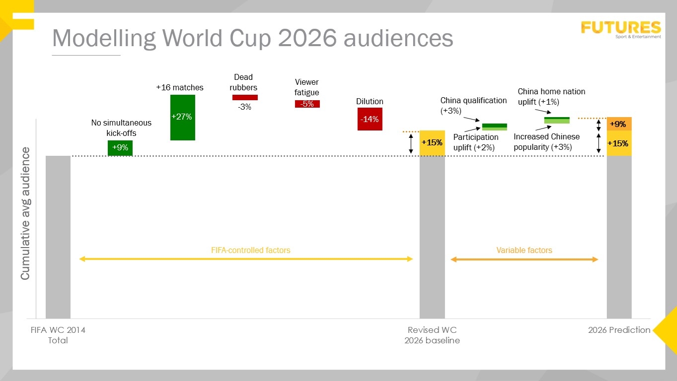 我們對16支擴軍球隊進(jìn)行了推測。主要受益者將是亞洲和非洲國家;這兩個(gè)大洲足聯(lián)在2026年可能各自擁有9支代表隊(相比2014年分別僅有4支和5支)。在此條件下參加世界杯賽事,預計可使相關(guān)市場(chǎng)的收視率提升約20%,其中可能包括一些未參加過(guò)2014年巴西世界杯的人口大國,如埃及(非洲足聯(lián))和土耳其(歐洲足聯(lián))。然而,迄今為止對全球收視率影響最大的變量將是中國是否晉級。中國晉級帶來(lái)的收視提升效應,將超過(guò)其余任何15支新晉球隊組合的總和。15支球隊的市場(chǎng)僅使我們預測的2026年總收視率增長(cháng)2%,而單單中國晉級即可帶來(lái)額外3%的增長(cháng)。