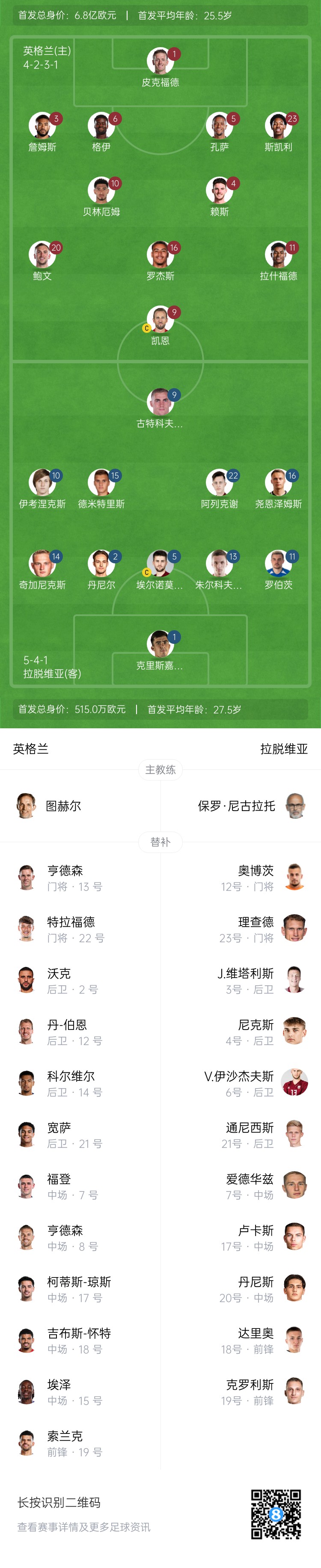 英格蘭首發(fā):1-皮克福德、3-詹姆斯、6-格伊、5-孔薩、23-劉易斯-斯凱利、4-賴(lài)斯、10-貝林厄姆、20-鮑文、16-羅杰斯、11-拉什福德、9-凱恩